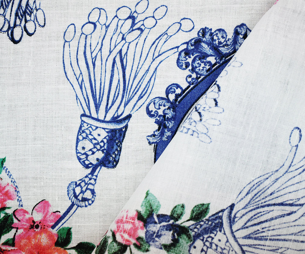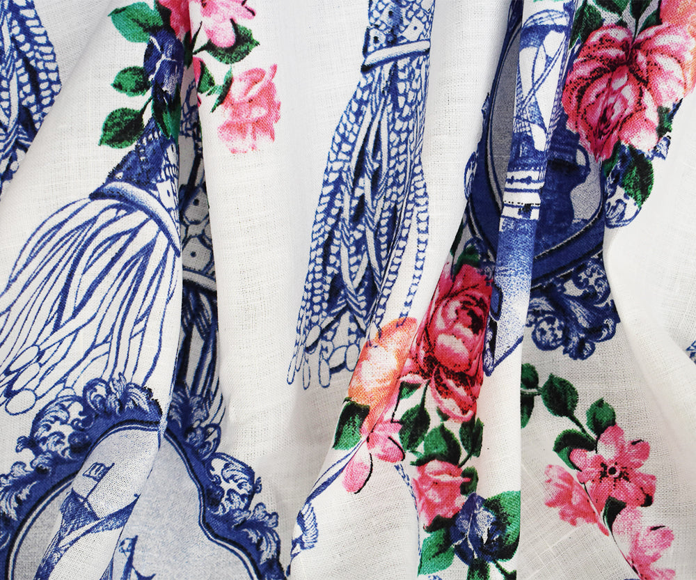 -100% linen plain woven fabric printed with a vintage inspired pattern featuring a ship portrait, tassels, and florals. Line if needed.