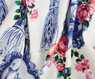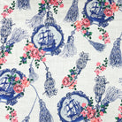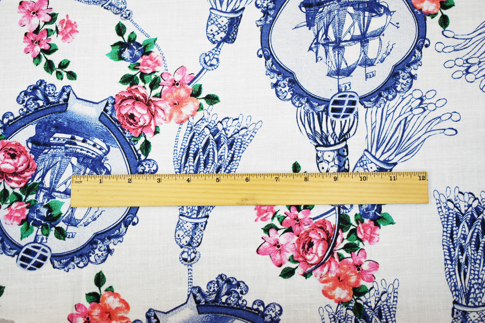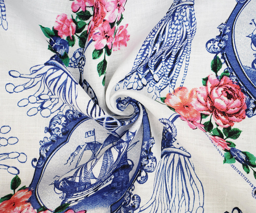Blue-White-Pink Floral Tassel and Ship Printed Linen Woven Fabric
