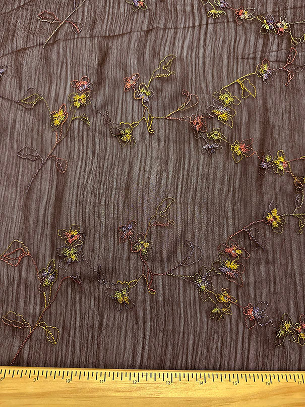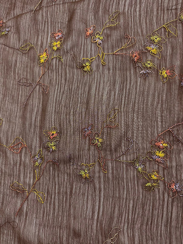 Brown Embroidered Floral Crinkled Poly Chiffon Fabric
