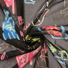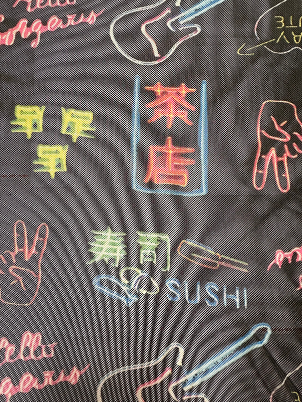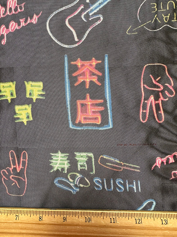 -Neon Pink, Neon Blue, Neon Green, Neon Red, Neon Yellow, & White Sign Print on Black Stretch Mesh Fabric