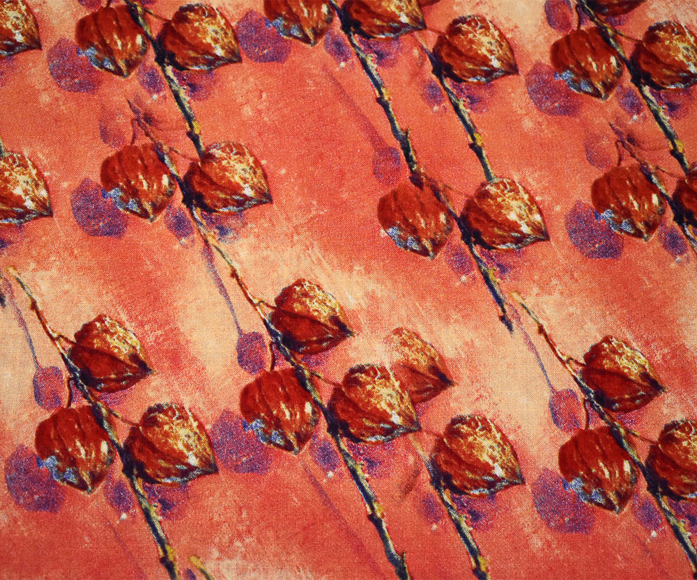 Orange-Red-Multi Leaf and Branches Pattern Printed Linen Woven Fabric