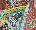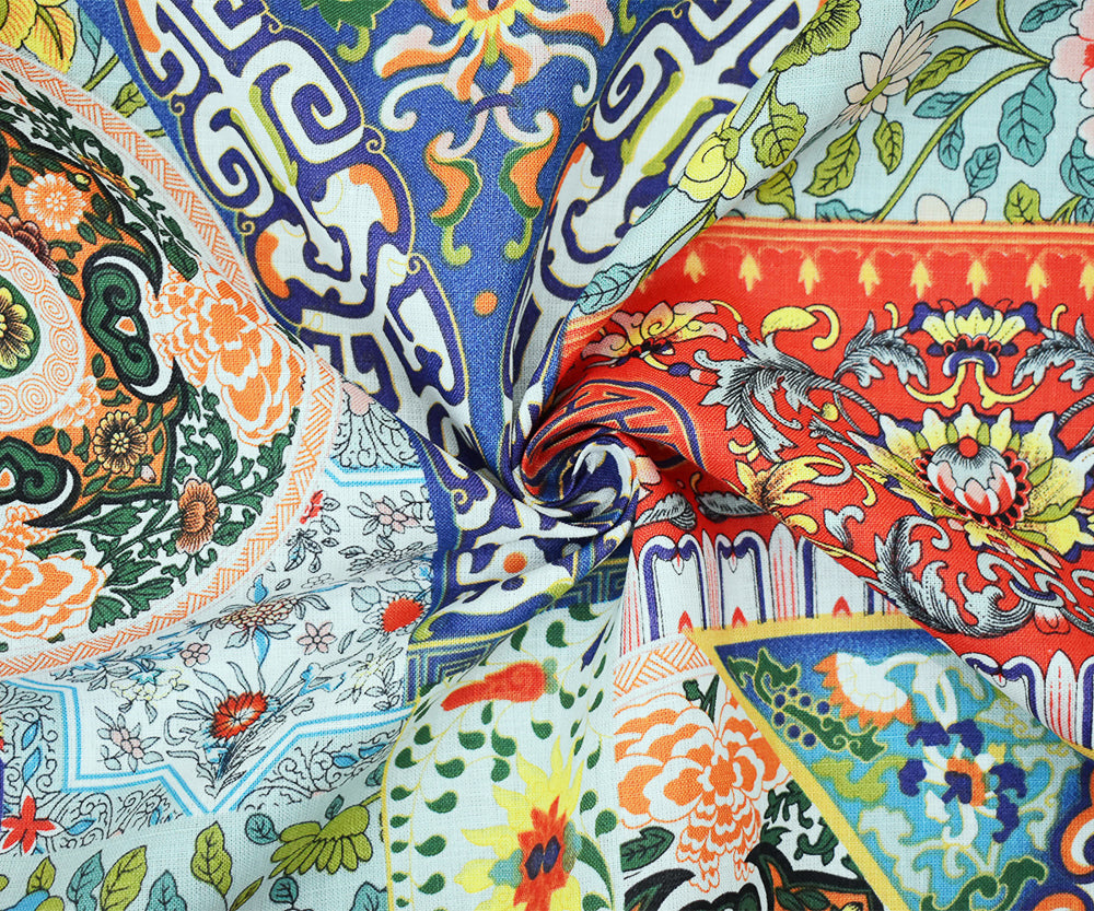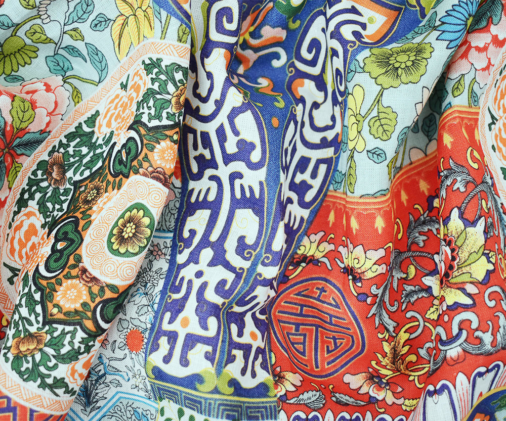 -100% linen plain woven fabric printed with an asian inspired pattern featuring medallions, florals, and tile-like elements. Line if needed.