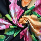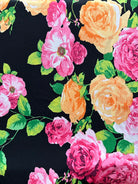 -Shades of Pink & Orange, White, & Green Roses Print on Black ITY Jersey Knit Fabric
