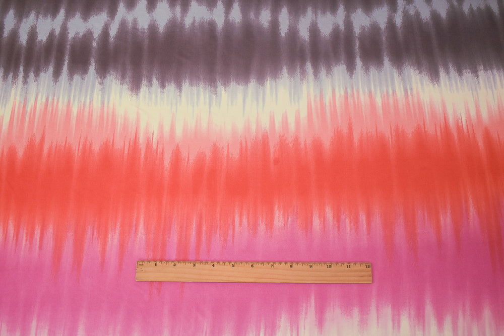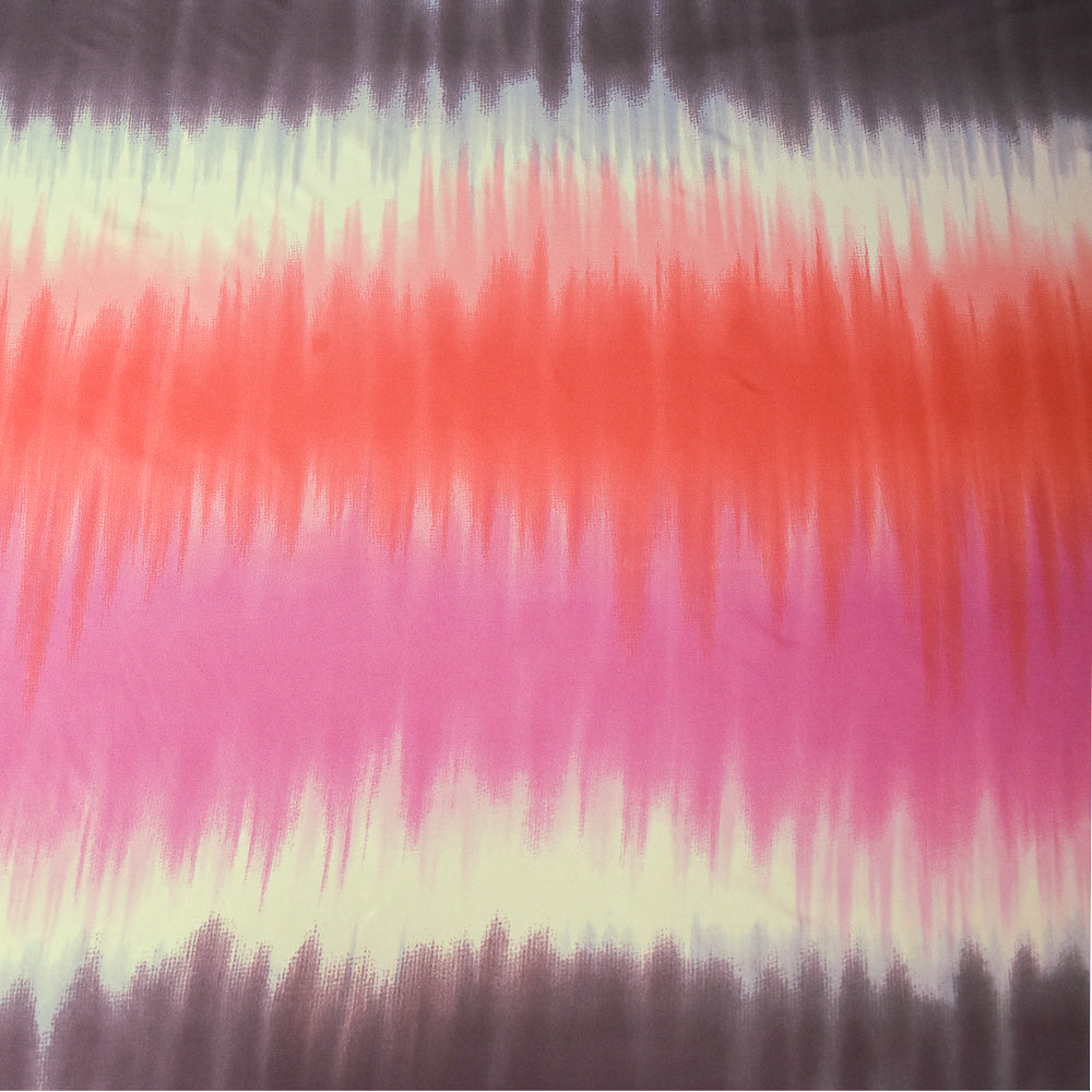 -100% silk jersey knit fabric printed with a tie dye pattern in a striped arrangement. Line if needed.