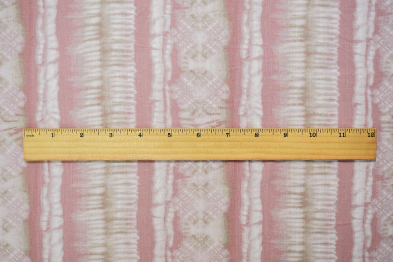 -This rayon fabric features a tie-dye pattern in a vertical striped arrangement print over a subtle cross-hatch texture, all woven into a soft challis base. The combination creates visual depth and a soft, fluid drape, ideal for unique blouses and flowing dresses.