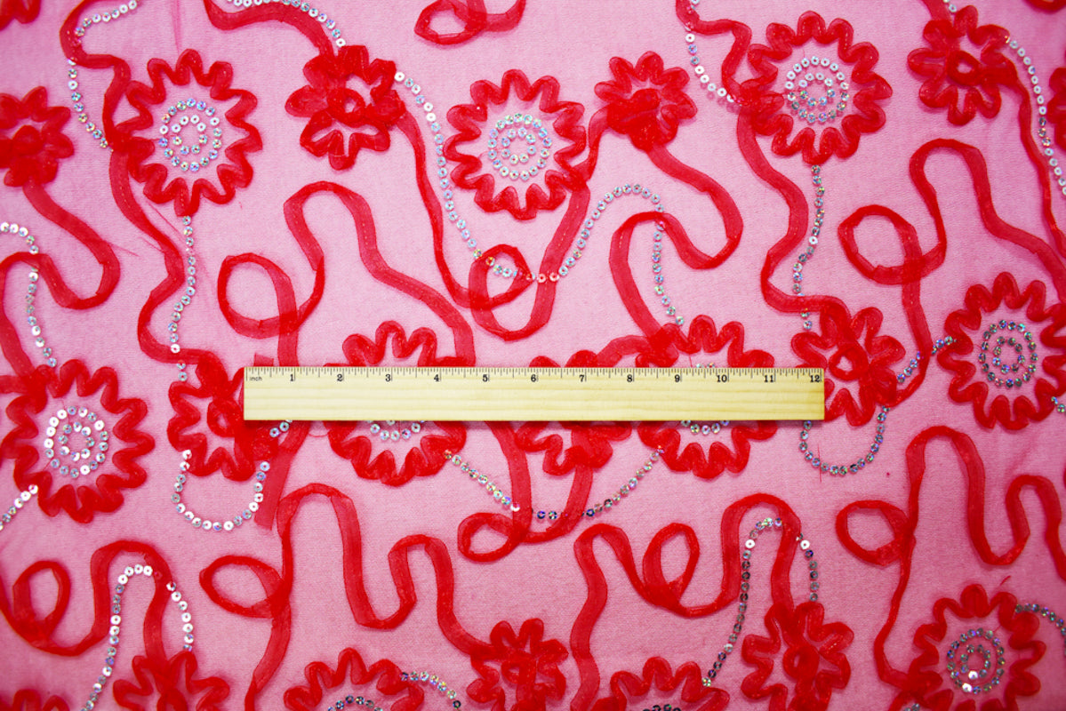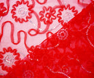 Red-Silver Nylon Floral Applique Sequined Mesh Tulle Fabric