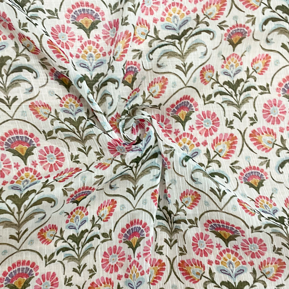 White-Green-Multi Poly Floral Printed Crinkle Yoryu Chiffon Woven Fabric