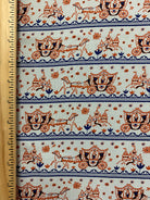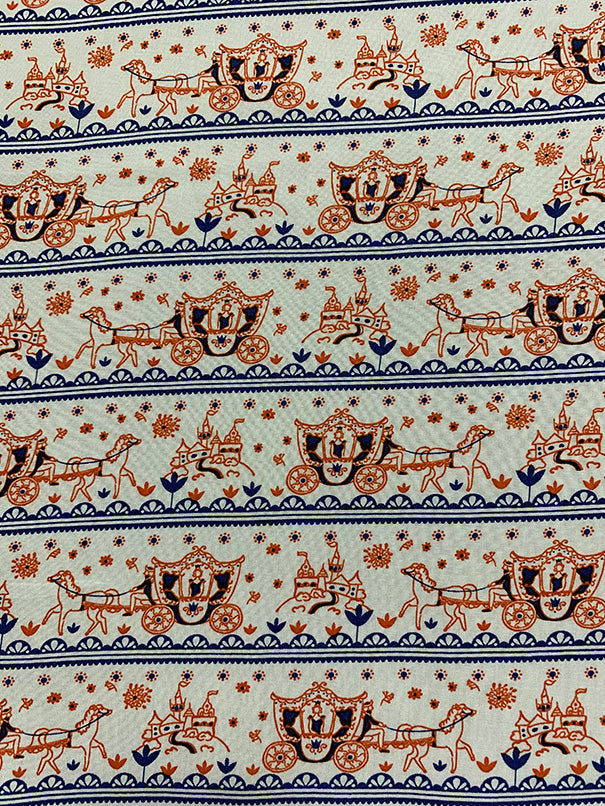 -White, Orange, Blue Multi Horse Carriage Horizontal Stripe Rayon Challis Fabric